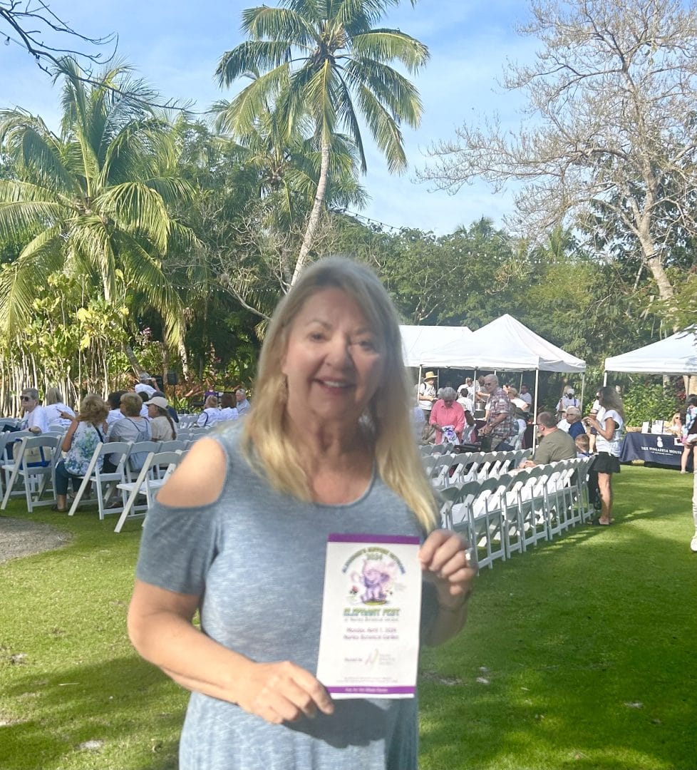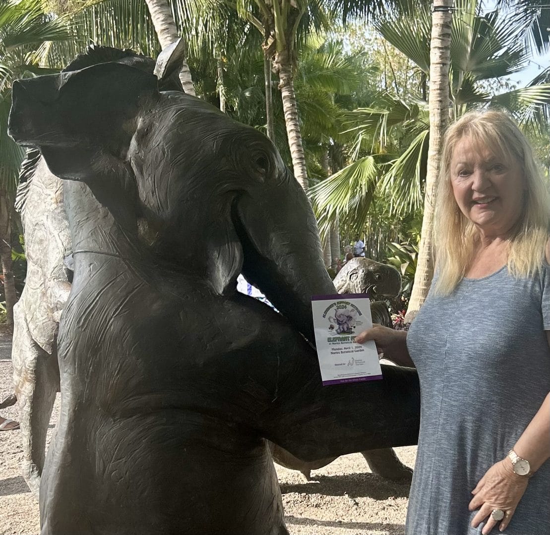 Catherine, representing Caregivers Survival, stands amidst colorful flowers and foliage at Naples Botanical Gardens during the Elephant Fest. She embodies warmth and compassion while supporting the Alzheimer's Support Network Fundraiser, demonstrating dedication to the cause of helping those impacted by Alzheimer's.